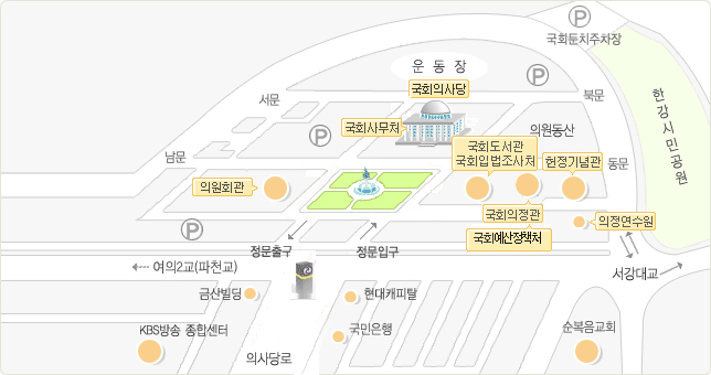 - [9호선 국회의사당역 하차] 1번, 6번 출구로 나와 도보 이용